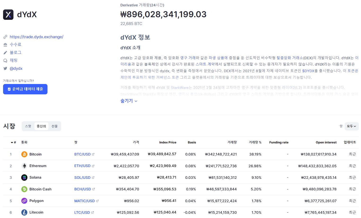 dydx DEX에서는 영구 거래쌍 목록에는 Ethereum, Bitcoin, Solana, Polygon, Avalanche, Uniswap이 포함됩니다. DEX 중에 독보적이라 할 수 있습니다.