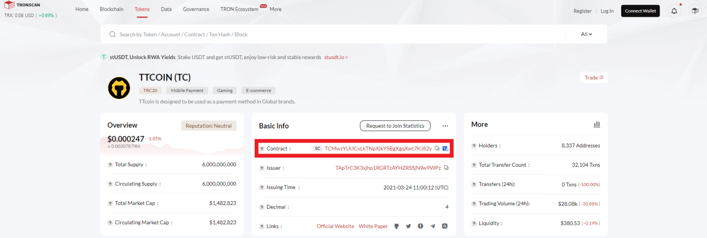 다음은 트론스캔에서의 TTCOIN에 대한 정보 페이지입니다.