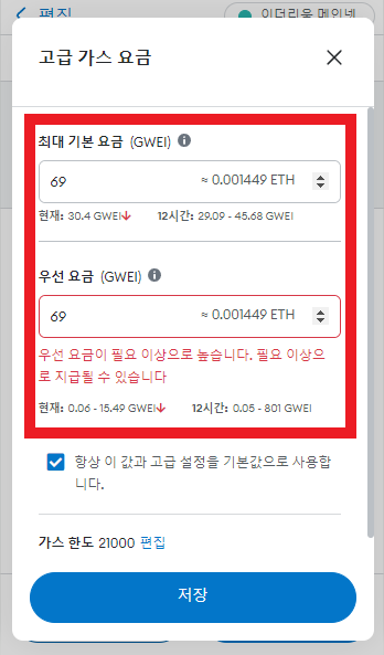 밑에 표기되는 현재 Gwei를 기준으로 높게 하거나, 낮게 조정하시면 됩니다.