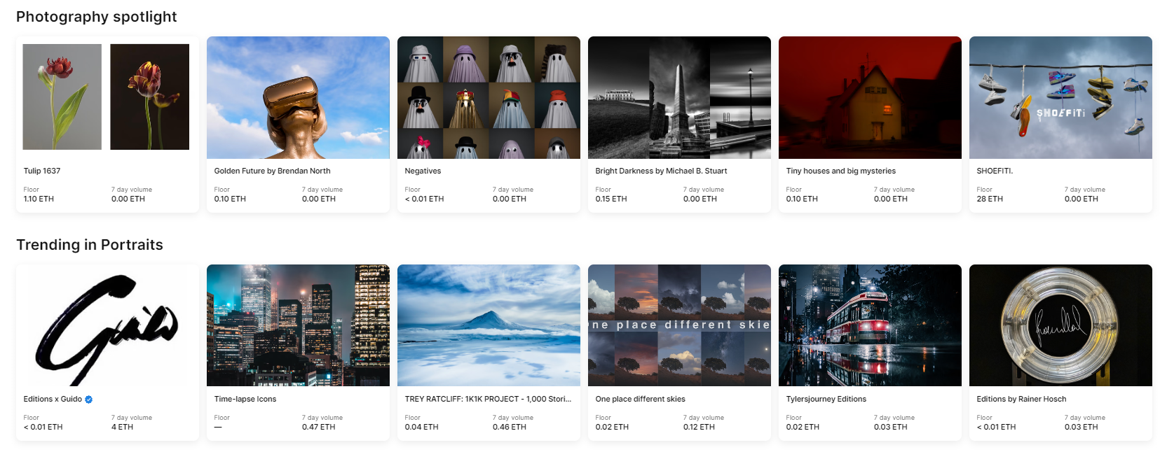 Photography는 사진 예술품을 거래하는 마켓입니다. 기존의 Art 카테고리와 중복되는 느낌이 있지만 오직 사진 이미지만 이곳에서 거래가 가능합니다. 다양한 사진작가들의 작업을 볼 수 있으며 Art 카테고리 만큼 규모가 큰 거래량을 차지합니다. 디지털카메라로 촬영한 컴퓨터 파일을 NFT화 시키기 쉬운 장점이 있기 때문인 것 같습니다. 굳이 전문가가 아니라 일반인들도 자신이 찍은 풍경이나 인물 사진을 영구 소장 디지털화를 위해 활용하기도 합니다.
