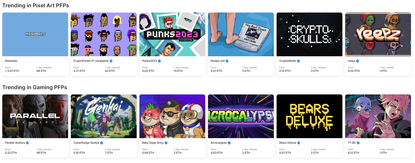PFPs는 쉽게 설명하면 프로필사진용(PFP) 이미지 등이 등록된 섹션입니다. 쉽게 카톡 프사라고 생각하시면 됩니다. 주로 트위터 프사로 사용되며 웹상에서 나를 나타내는 정체성 등으로 표현되고 소비되는 NFT들입니다. PFP NFT라고 하면 가장 먼저 생각나는 크립토 펑크가 있으며 최근에는 가장 비싼 프사인 BAYC라는 원숭이가 거래되는 마켓입니다. 오픈씨와 NFT마켓 전체에서 가장 높은 거래량이 발생하는 곳입니다. NFT에서 PFP와 게이밍 NFT 유형이 양대산맥이라고 할 수 있습니다.